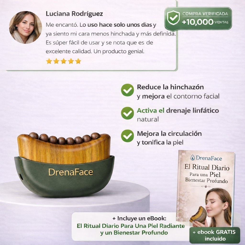DrenaFace es una herramienta de masaje facial diseñada para acompañar rutinas de autocuidado, ayudando a estimular la piel del rostro y el cuello de forma suave y natural.